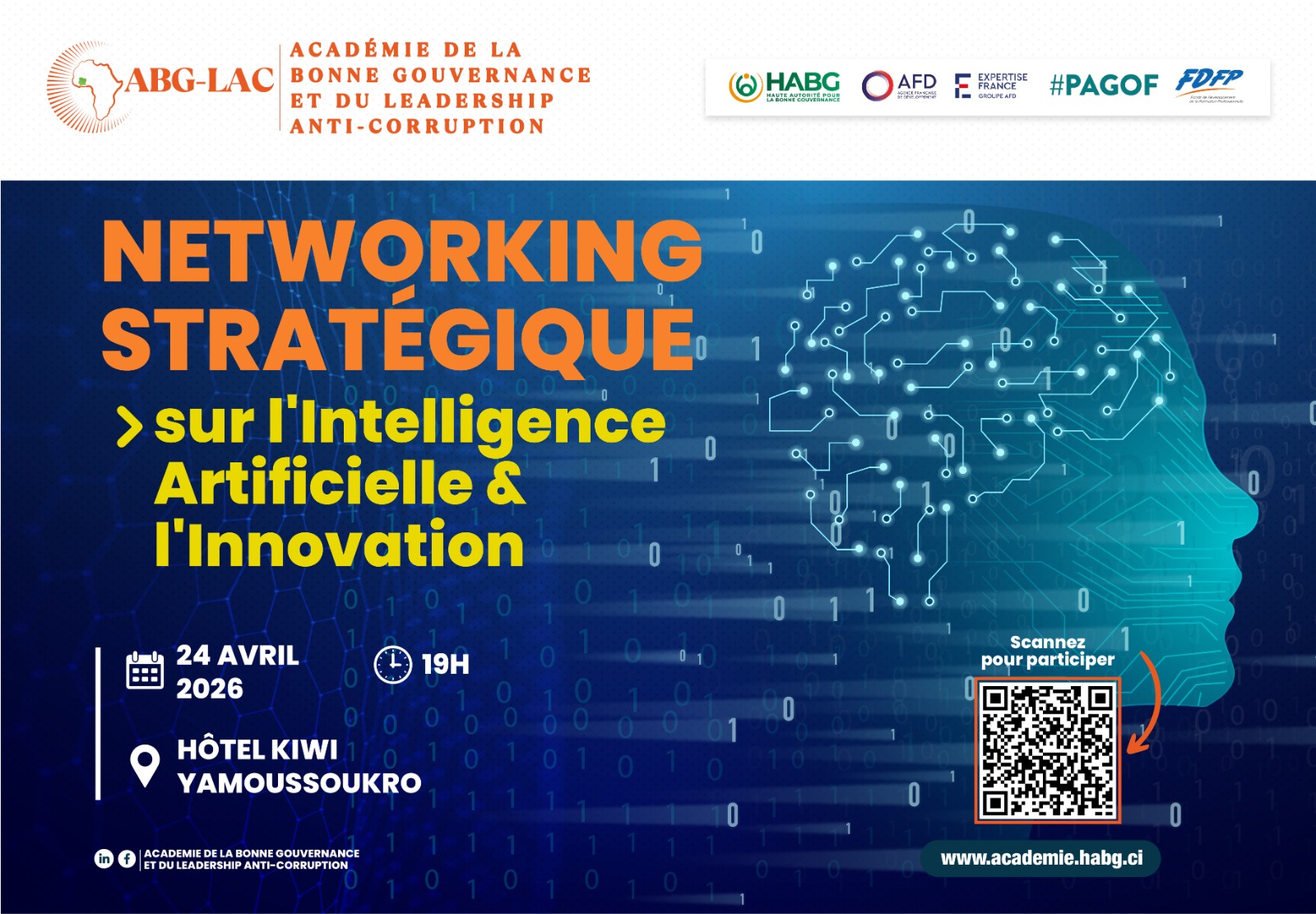 Dans le cadre de sa session de formation à l’endroit des entreprises publiques et privées, l’Académie de la Bonne Gouvernance et du Leadership Anti-Corruption (ABG-LAC) organise un side event dédié à l’intelligence artificielle. Jeudi 24 avril 2026 À partir de 19h Hôtel KIWI Un moment d’échanges pour explorer les enjeux et opportunités de l’IA au service de la gouvernance et de la performance des organisations.